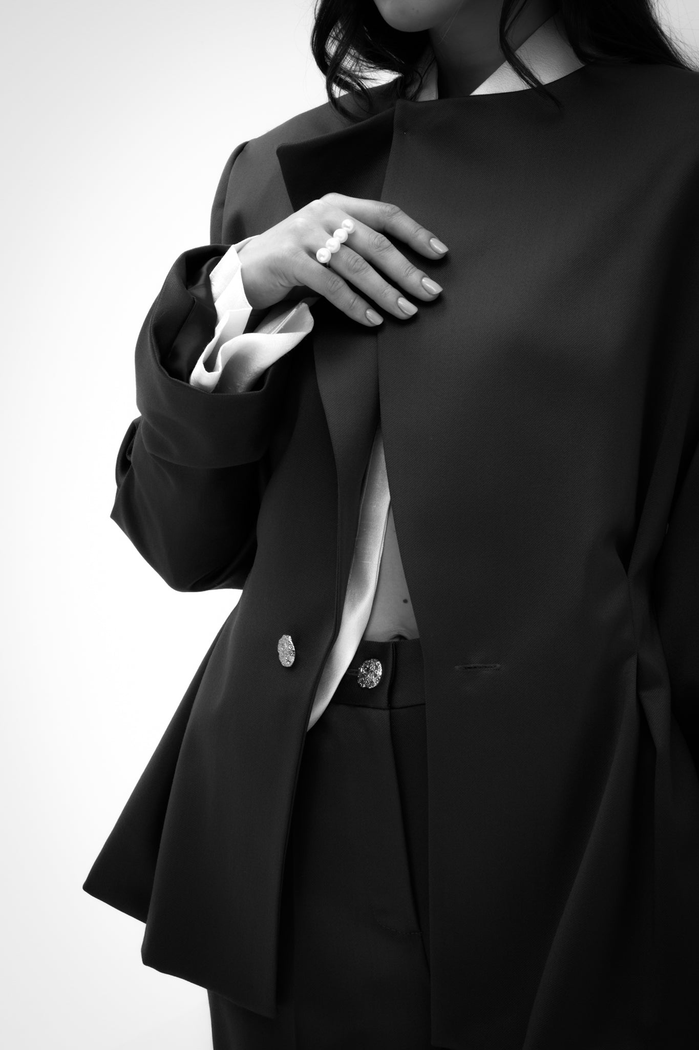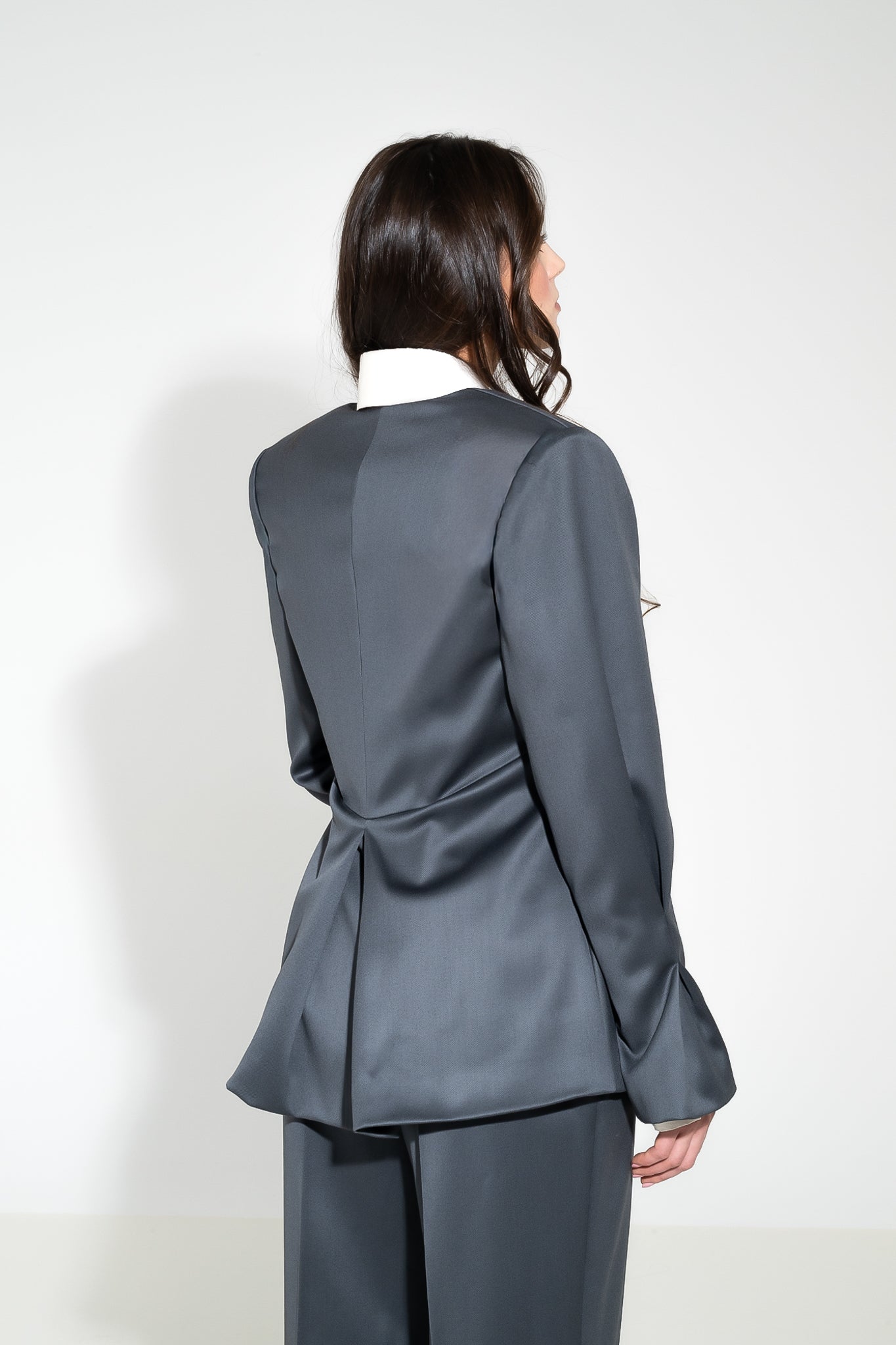 Grey blazer crafted from 100% wool, featuring a subtle natural sheen that adds a refined and distinctive elegance. It includes a pronounced, asymmetrical lapel and front–back pleats that enhance both structure and movement. The sleeves are shaped with pleats as well, emphasizing the blazer’s refined construction. Finished with a gold-toned metal button, it can be worn as a full suit when paired with the matching trousers.
