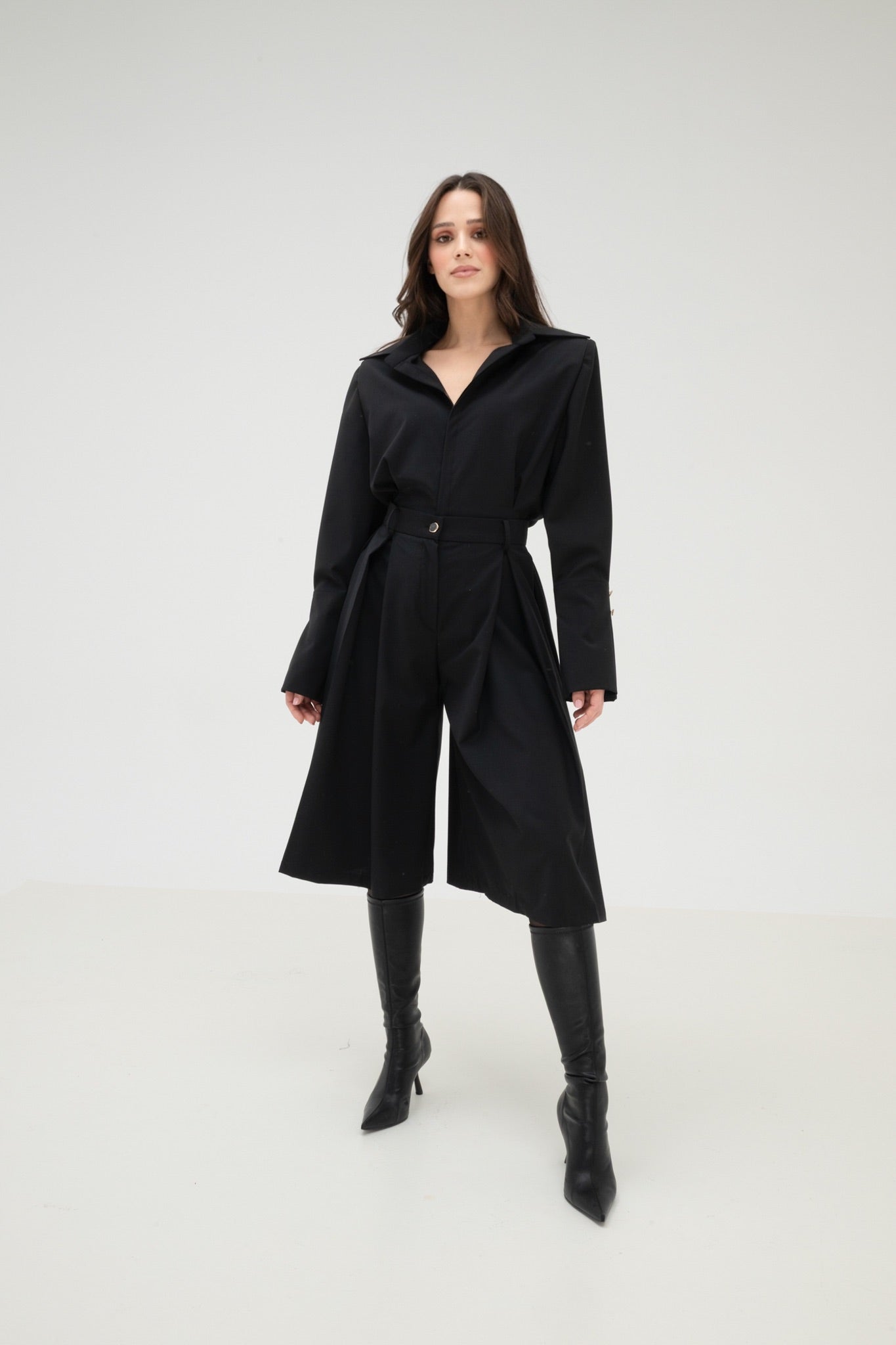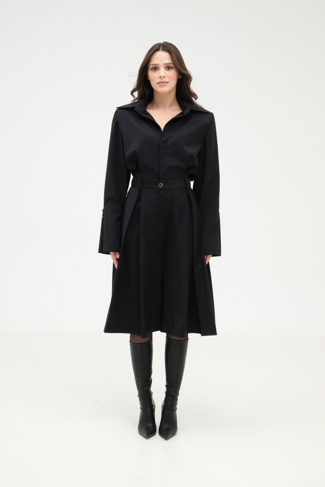 Below-knee trousers crafted from a virgin wool blend, featuring double pleats for a structured and elegant effect. The silhouette combines comfort with sophistication, suitable for both casual-chic and more formal occasions. Front zip closure is complemented by a matching button with a subtle gold detail, adding a refined touch.