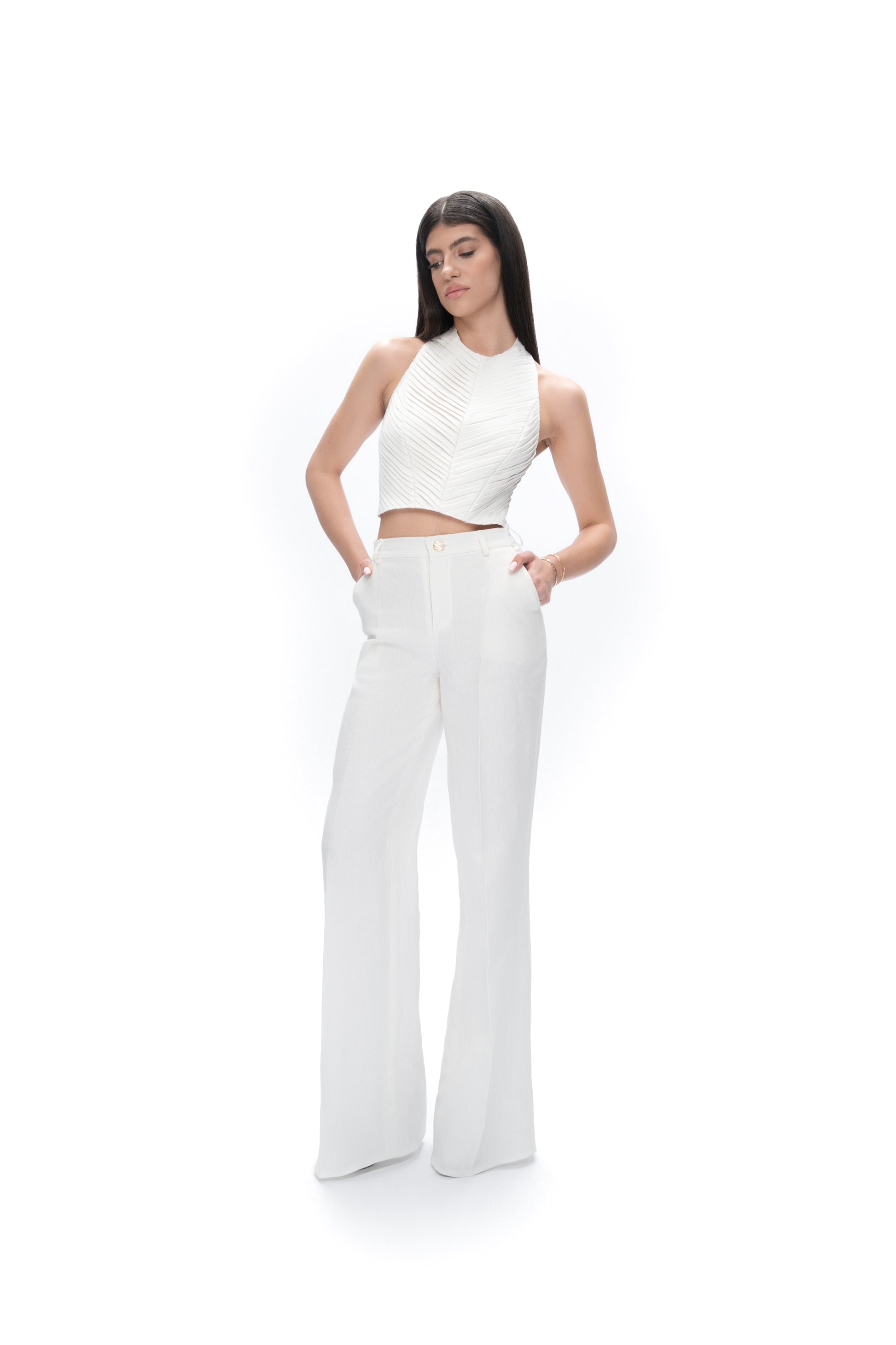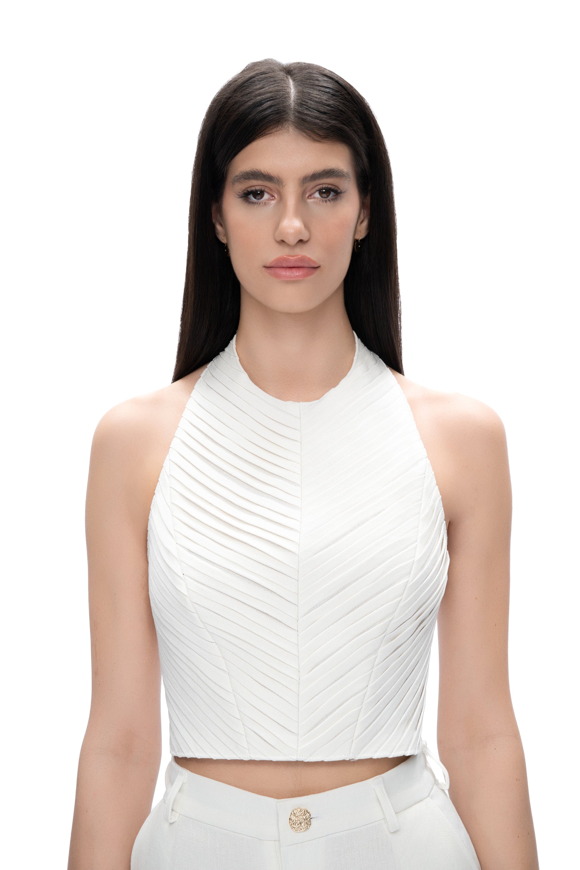 Crafted from 100% GOTS-certified hemp, this top features refined pin-tuck details at the front and an open back finished with a gold-shine metal zipper. The crisp structure and bold back design strike a balance between elegance and edge.